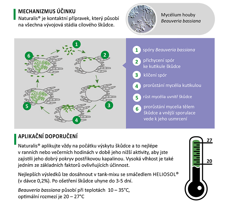biologický insekticid obsahující životaschopné spory houby Beauveria bassiana. Jedná se o přirozeně se vyskytující houbu, která redukuje výskyt hmyzu a roztočů napadajících ovoce, zeleninu a okrasné plodiny. Působí primárně kontaktním působením. Konidie Beauveria bassiana ulpí na kutikule hmyzu a roztočů, vyklíčí a pronikne do hostitele. Smrt je způsobena mechanickým průnikem mycelia, jeho prorůstáním a následnou ztrátou vody a živin hostitele v kombinaci se sekrecí hydrolytických enzymů houby. -